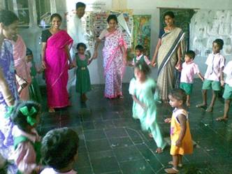 Katz und Maus-Spiel (in Indien heißt es „Tiger und Ziege“). Die kleine Tochter von M. Saraswathi (sie wurde geboren, als ich im Oktober 2006 nach Indien kam, um die Arbeit mit der Schule zu beginnen...) steht interessiert in der Mitte des Kreises und beobachtet das Geschehen