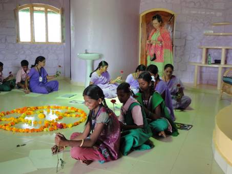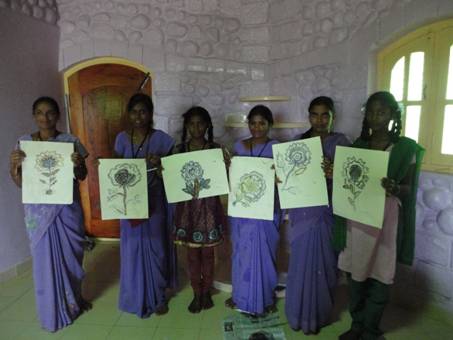 Andrea Partheymueller-Gerber und Angelika Gigauri, Lehrerinnenund Kuenstlerinen aus Kulmbach/Bayern, kamenzum dritten Mal nach Mudigubba, um uns mit ihrem umfangreichen Wissen und Erfahrungsschatzzu beschenken. Lehrer/innen und die 7. Klasse nahmen am Workshop teil. Zu Beginn wurde ein Mandala aus Rosen und Tagetes –dem Rohmaterial fuer die herzustellenden Farben- gelegt.