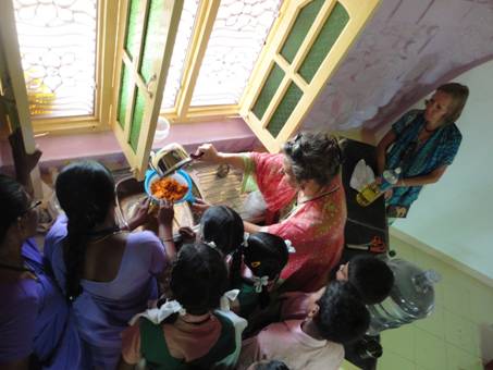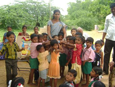 Kindergartenlehrerin Anasuya erhaelt Geschenke von den Kleinen