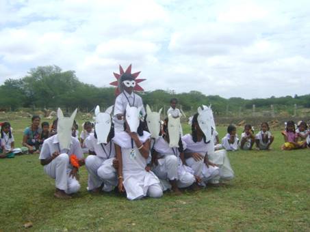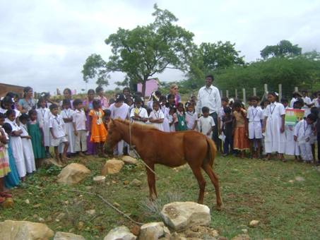 Nachdem Raju gebuehrend gewuerdigt worden war, sangen die Kinder Lieder und fuehrten kleine Theaterstuecke, Szenen und Geschichten auf. Eine Ausstellung von bunten Pferdebildern - gemalt von den Kindern aller Klassen – wurde gezeigt. Es war ein anregender und froehlicher Vormittag, der das Thema in breiter Vielfalt darbot und neue Aspekte bewusst machte. Wer weiss beispielsweise, dass nach einem antiken Mythos die Sonne von sieben Pferden gezogen wurde?