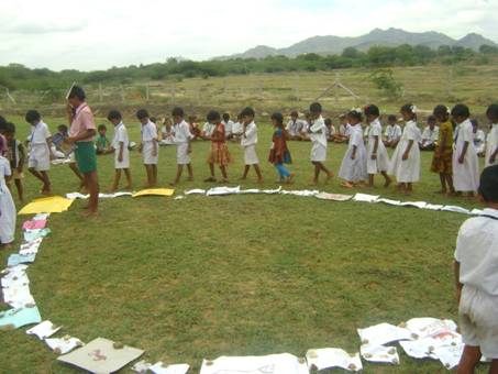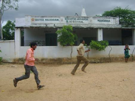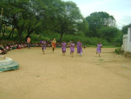 Am 4. September, vor dem Teacher’s Day – der am 5. 9. an vielen indischen Schulen gefeiert wird – fand erstmaligein Sport- und Spieletag fuer das Lehrpersonal statt. Anlass war die Einfuehrung unserer neuen Sportartikel wie Speer, Kugel, Tau etc. Die Schueler/innen feuerten die Lehrer/innen an, applaudierten und genossen sichtlich, den Erwachsenen bei ihren Aktivitaeten zuzuschauen. Die Stimmung stieg immer mehr im Laufe des Events, der vor der alten Schule zelebriert wurde. Kugelstossen, Speerwerfen, Seilspringen, Tauziehen, Wettrennen, die „Reise nach Jerusalem“ sowie als Abschluss ein Malwettbewerb waren die Disziplinen, die von den beiden Maennern und den acht Frauen– alle im Sari (!) - durchgefuehrt wurden. Da der Sportbei uns noch neu ist (an den meisten Schulen hierzulande wird er nicht angeboten), diente dieser Spieletag auch zur Motivation der Kinder - das ist wohl sehr gut gelungen... Auf dem neuen Schulgelaende wird ein Sportgelaende entstehen, das fuer vier Ballarten vorgesehen ist. Eine Hoch- und Weitsprunganlage, die rege und gerne genutzt wird, gibt es bereits. Auch ein Natur-Kletterspielplatz fuer die Kleinen soll errichtet werden, indem die reizvollen Gesteinsformationen am Nordrand des Gelaendes gereinigt und teilweise mit Erde gefuellt werden.