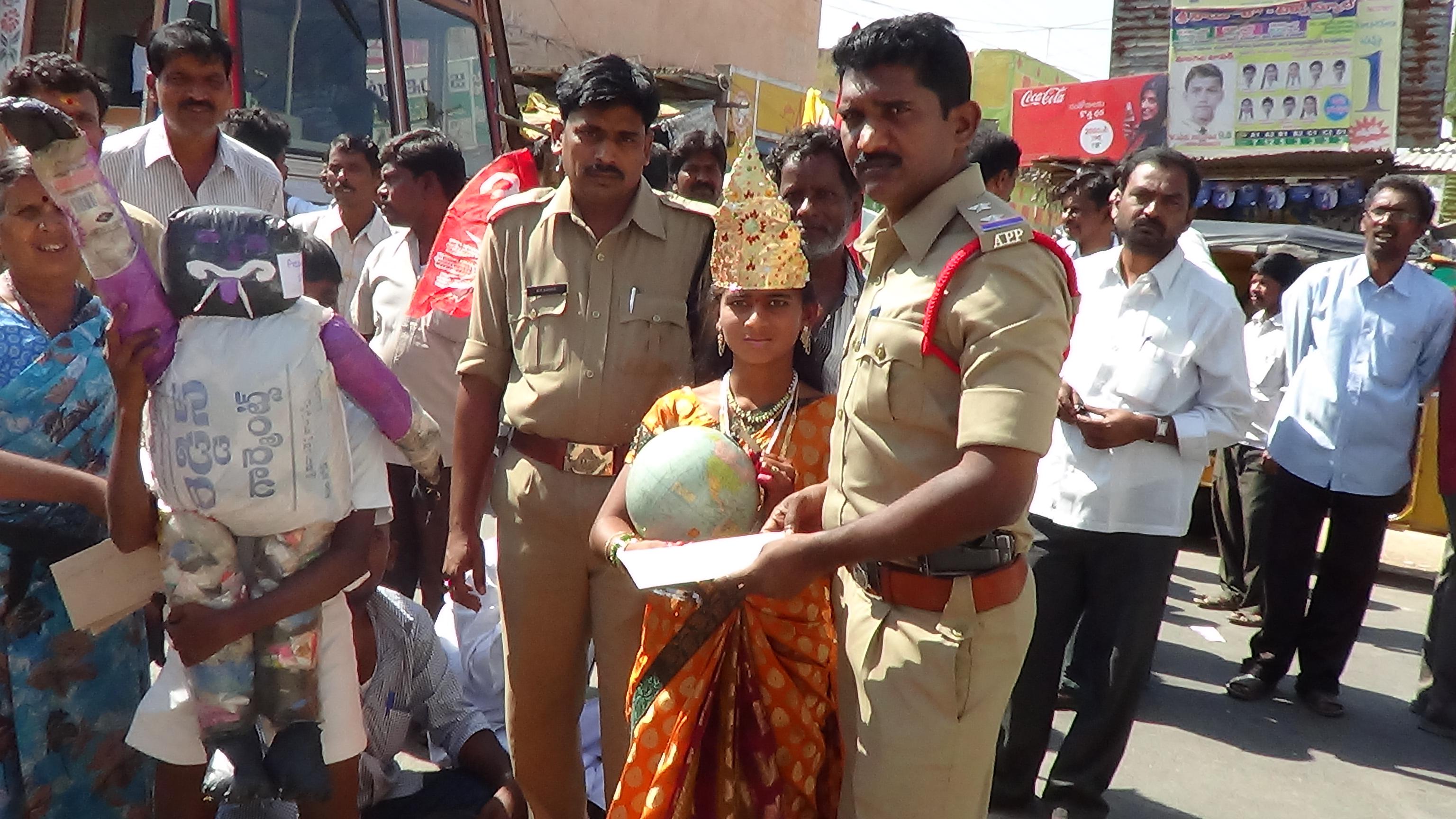 On the third day the upper classes went into the „Old village“; most of our students live there. They informed the people about the dangers of plastic garbage. Fifty posters of the Karuna Society discussing the problems with “Plastic Cows” were fixed at house walls and public buildings. The children showed the preparation of paper bags – as an alternative to the painful plastic covers – and of ropes drilled of plastic covers. They tried to convince the people to ban plastic covers. On the fourth day teachers and students went for a rally; several offices in Mudigubba were visited. All the officers received petitions demanding a ban of plastic covers... The petition is planned to be presented to the Collector in the District capital Anantapur as well; the Mandal Revenue Officer will hand it over to him.