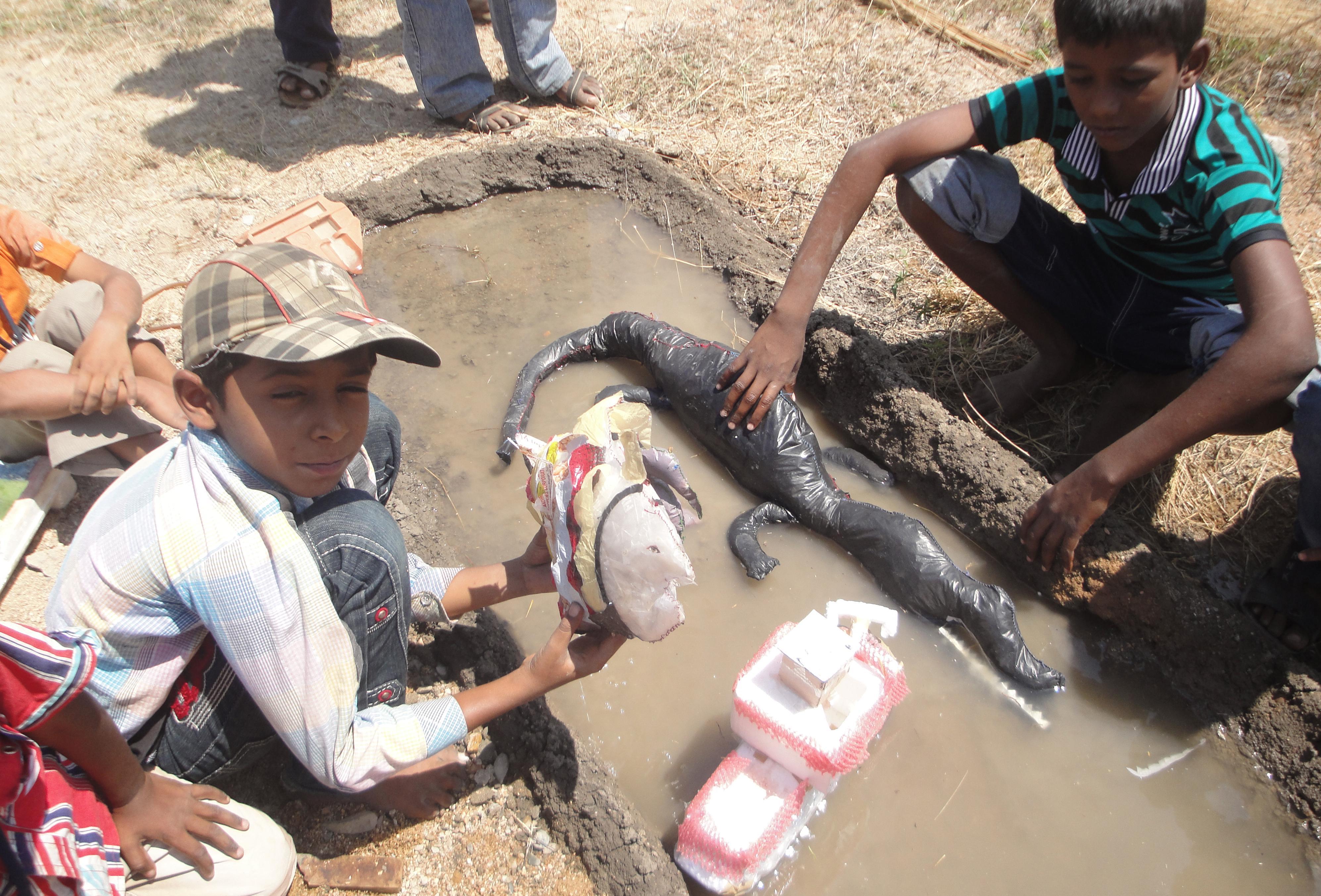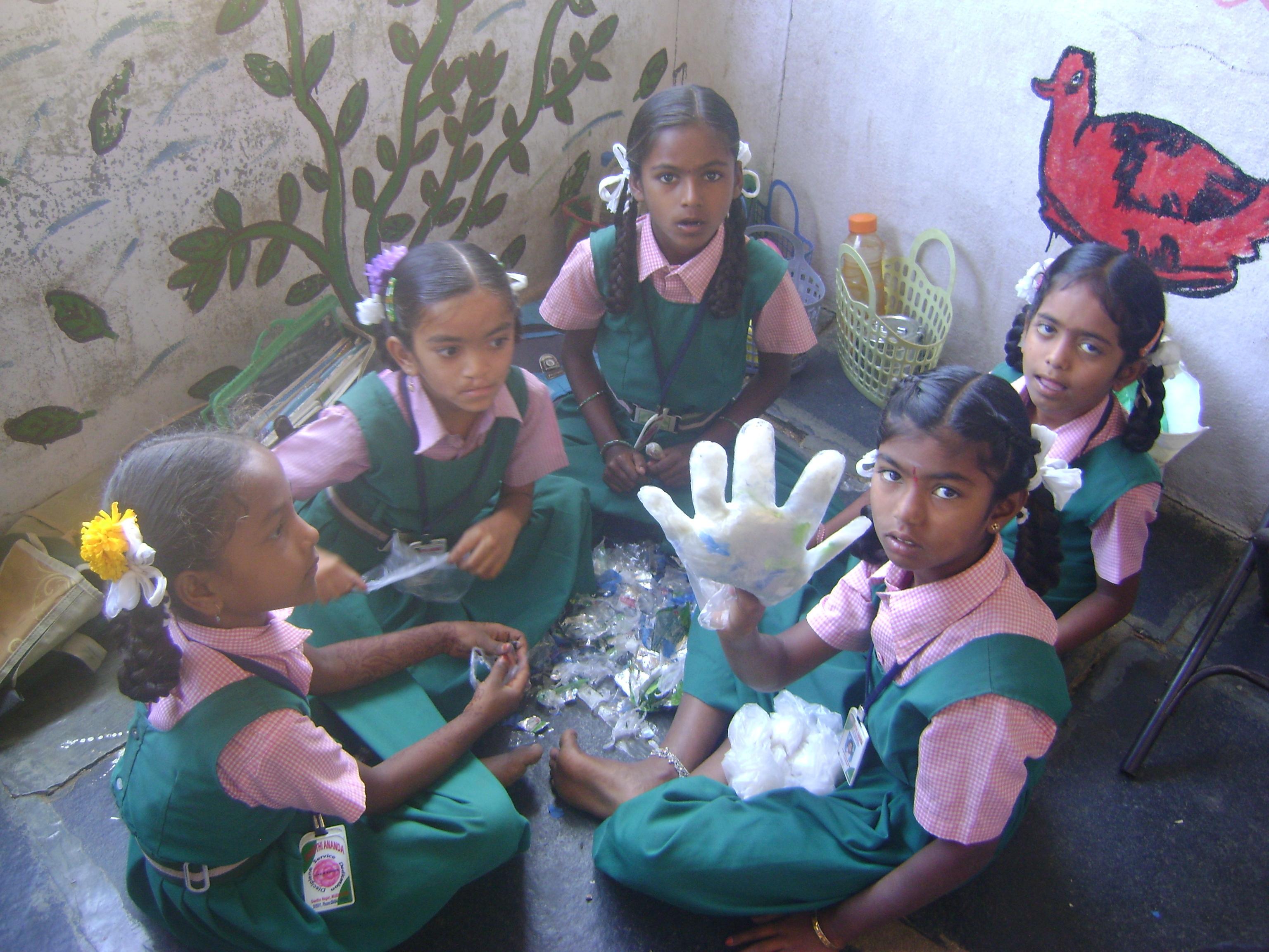 The main slogan was „Reduce, reuse, recycle“, inspired by the Karuna Society in Puttaparthy. On the first day the students collected plastic covers in the surrounding of the school as material for creating beautiful items like animals, fruits, vegetables and a big variety of decorations. Huge, big and small animals as well as a “plastic monster” and dolls were created – as well a cow eating plastics. All the fillings of the stitched items consisted of plastics only. The techniques (cutting, stitching and filling), learnt by teacher Zahrunnisha in the last summer holidays at a “Teddy bear” course, were practically used by doing this.