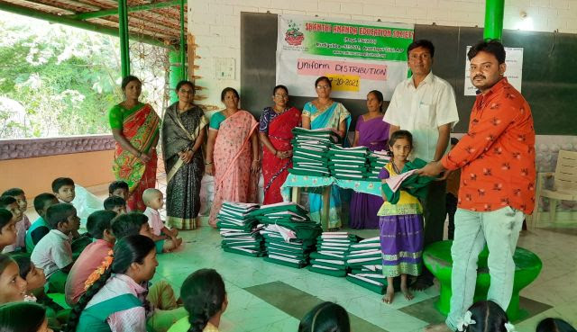 Die Schüler erhalten alle zwei Jahre neue Uniformen, die Neuankömmlinge jedes Jahr. Jährlich werden den Schülern neue Bücher ausgehändigt. Auch in diesem Jahr verteilte die Shanti Ananda Education Society Schuluniformen und Bücher an alle unsere 170 Schüler. Die Bücher wurden in den Homeschooling-Zentren abgegeben, da die Schule zu diesem Zeitpunkt geschlossen war (Lockdown).