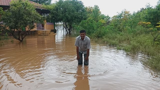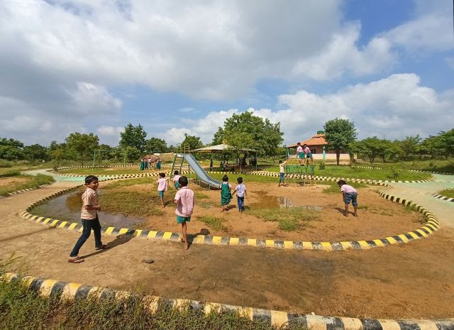Dieses Jahr hat es im Anantapur District und an anderen Orten ausserordentlich viel und ueber einen laengeren Zeitraum hinweg geregnet; das Schulgelände ist grün wie nie zuvor und erinnert an einen Wald. Am 17. November kam es zu sehr heftigen Regenfällen, die unser Schulgelaende erneut überschwemmten, genau wie vor vier Jahren. Der südliche Teil war eine Woche lang überflutet; drei Klassenzimmer und das Gästehaus waren trockenen Fusses nicht zu erreichen. Noch ist etwas Wasser auf dem Gelaende, aber der Hoehepunkt ist überschritten. Vier Klassenräume sind noch von Wasser umgeben; das Gästehaus ist weiterhin nur durch Wasser hindurch oder per ‘Quereinstieg’ erreichbar. Der Kindergarten und die 1. Klasse wurden aus Sicherheitsgruenden vorübergehend in das Verwaltungsgebäude verlegt, während die Klassen 5 bis 7 in den Klassen der Kleinen unterrichtet werden.
