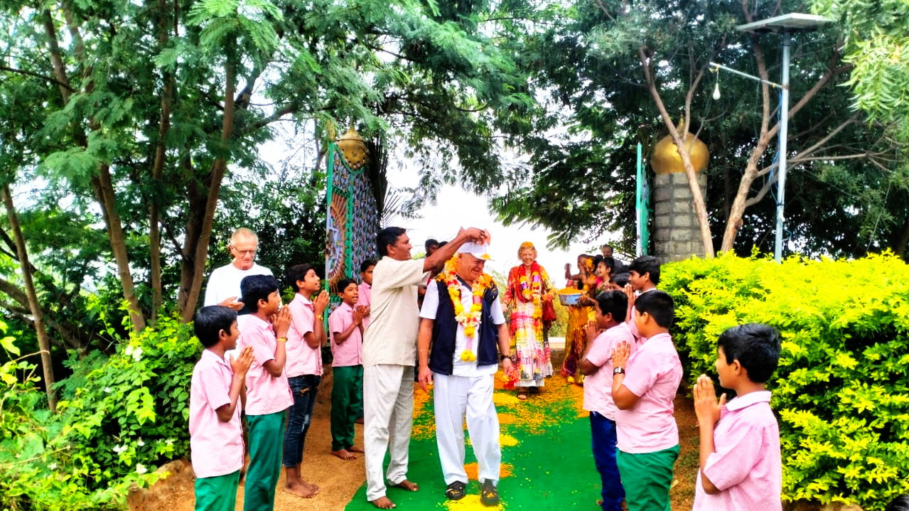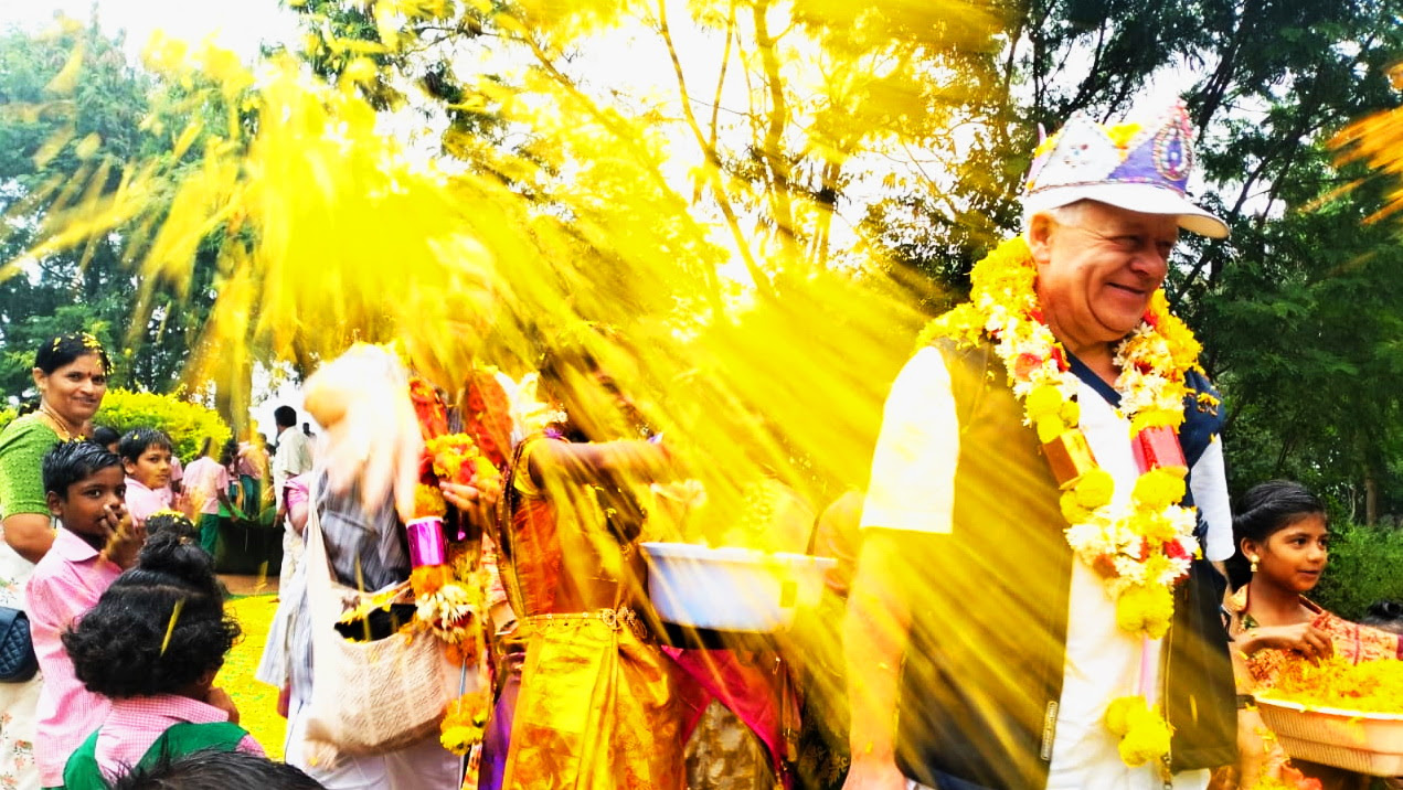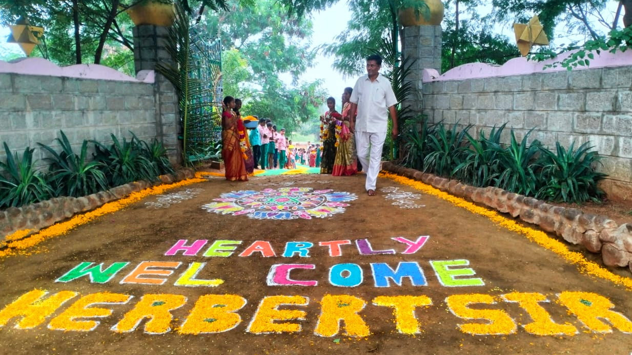Raja Sekhar, der Schulleiter, hatte einen langen Teppich aus Yogamatten vom Eingangsbereich bis in das Verwaltungsgebäude legen lassen, Herbert wurde von Raja mit einer Blumengirlande behängt und die Schüler überschütteten ihn den ganzen Weg zum Administration Building mit Blumen.