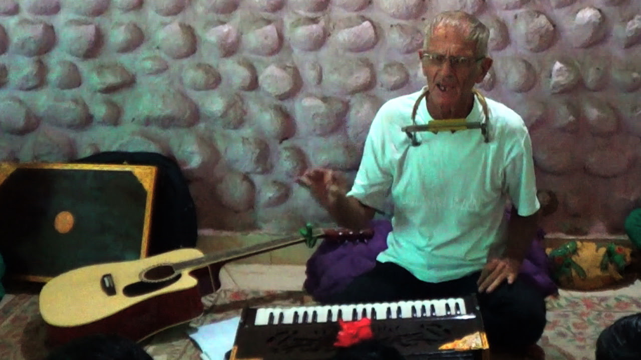 Anschließend kam Klaus mit Bhajanas zum Einsatz. Er war einige Jahre Musiklehrer bei uns gewesen, führte Bhajan-Workshops für Lehrer und war erstmalig seit drei Jahren wieder in der Schule.